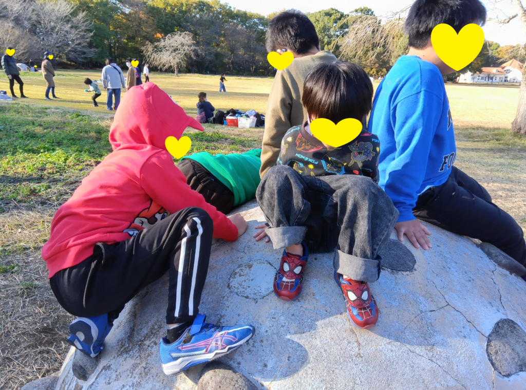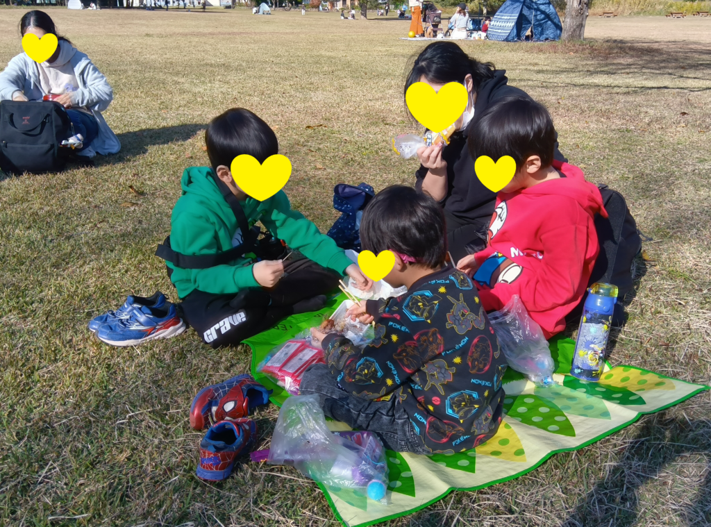 わんぱく公園の風の原っぱで、レジャーシートを敷いてみんなでお弁当や買ってきたお菓子を食べました♪